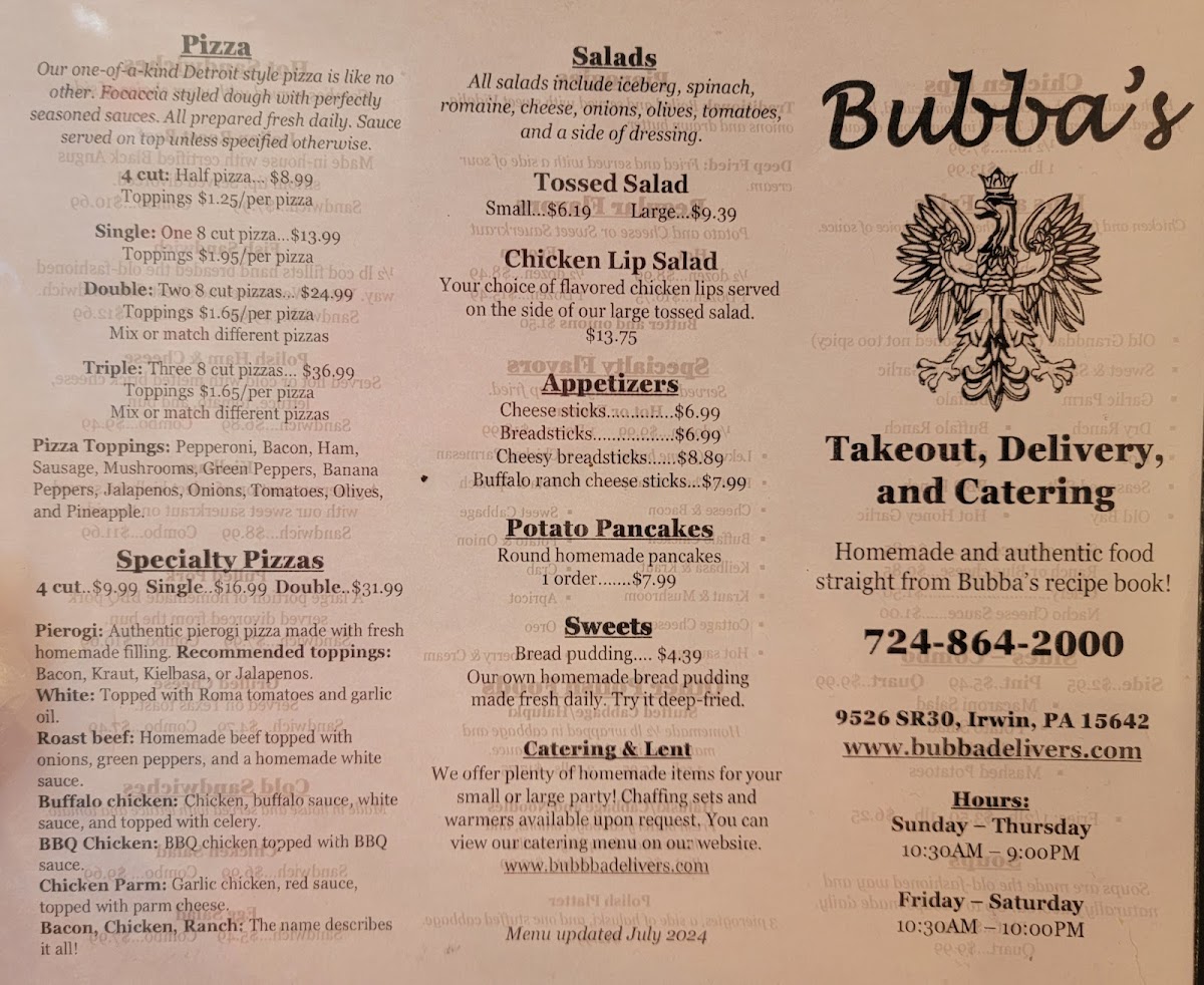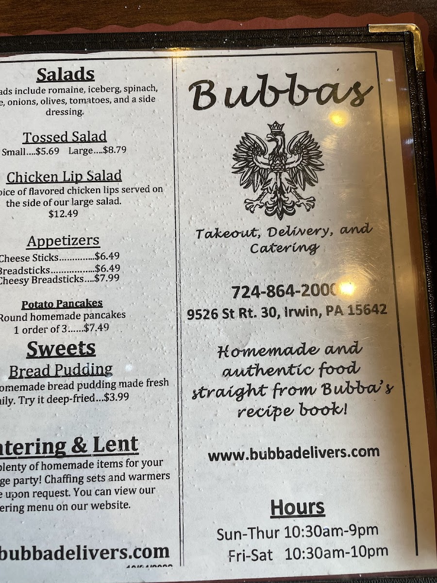 Bubba's offers a menu that feels rooted in home-style comfort with a focus on hearty, traditional Polish-American dishes. The selection ranges from satisfying sandwiches and soups to classic pierogies and stuffed cabbage, making it a great spot for casual meals any day of the week.